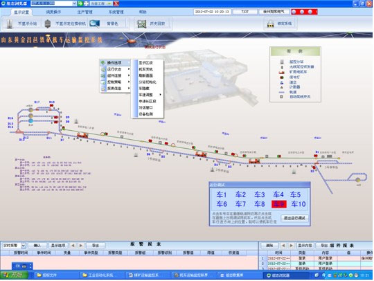 系統(tǒng)是用于惡劣環(huán)境的分布式工業(yè)控制系統(tǒng),系統(tǒng)以工控機(jī)為控制核心,在主控室對(duì)井下的架線電機(jī)車(chē)運(yùn)輸實(shí)現(xiàn)實(shí)時(shí)監(jiān)控和自動(dòng)調(diào)度。主要是控制架線區(qū)段內(nèi)有車(chē)有電無(wú)車(chē)無(wú)電目的。大大降低人員觸電事故的發(fā)生,并能實(shí)時(shí)顯示井下各架線段停送電狀態(tài)、各機(jī)車(chē)位置、車(chē)號(hào)及信號(hào)燈、區(qū)段占用情況,自動(dòng)實(shí)現(xiàn)敵對(duì)進(jìn)路的閉鎖,不允許敵對(duì)信號(hào)同時(shí)開(kāi)放,保障機(jī)車(chē)安全運(yùn)行。系統(tǒng)能隨時(shí)反映設(shè)備和傳感器的工作狀態(tài);故障自動(dòng)診斷、報(bào)警,記錄運(yùn)行過(guò)程數(shù)據(jù),具有報(bào)警、自動(dòng)記錄運(yùn)行過(guò)程數(shù)據(jù)報(bào)表打印等功能。監(jiān)控系統(tǒng)能實(shí)現(xiàn)岔位信號(hào)上傳并實(shí)現(xiàn)道岔的集中監(jiān)視和控制,同時(shí)實(shí)現(xiàn)機(jī)車(chē)車(chē)載按鍵遙控控制架線和道岔的功能。巷道硐室配一臺(tái)服務(wù)器電腦,在井上調(diào)度室設(shè)置一臺(tái)客戶端電腦作為監(jiān)視觀看和操作調(diào)度。