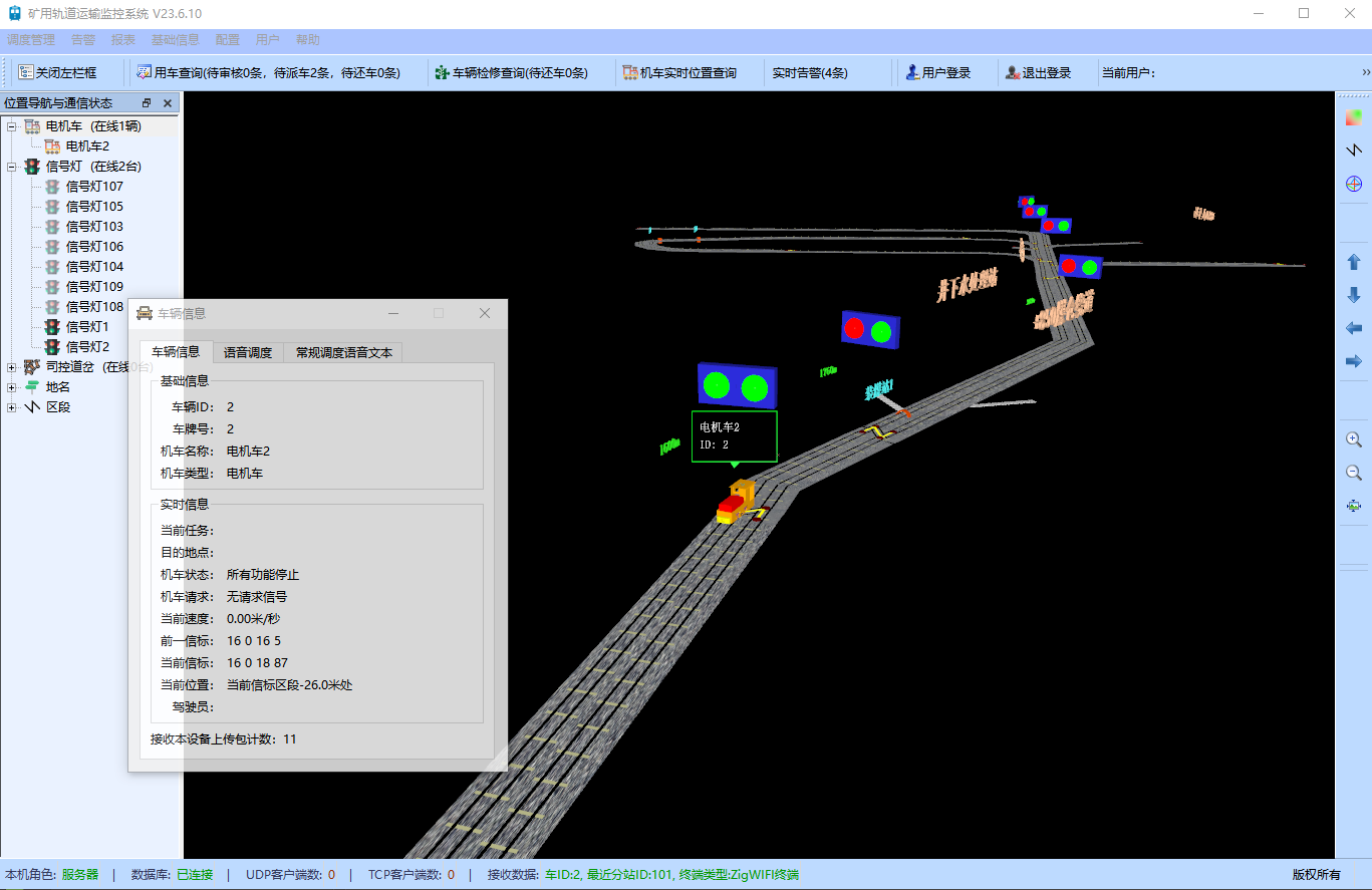 在計(jì)算機(jī)上以2D或3D動(dòng)畫(huà)、圖形、表格、漢字等形式實(shí)時(shí)顯示機(jī)車(chē)位置、車(chē)號(hào)、運(yùn)行方向、運(yùn)行速度以及井下各道岔位置和信號(hào)燈等運(yùn)行狀態(tài)信息。